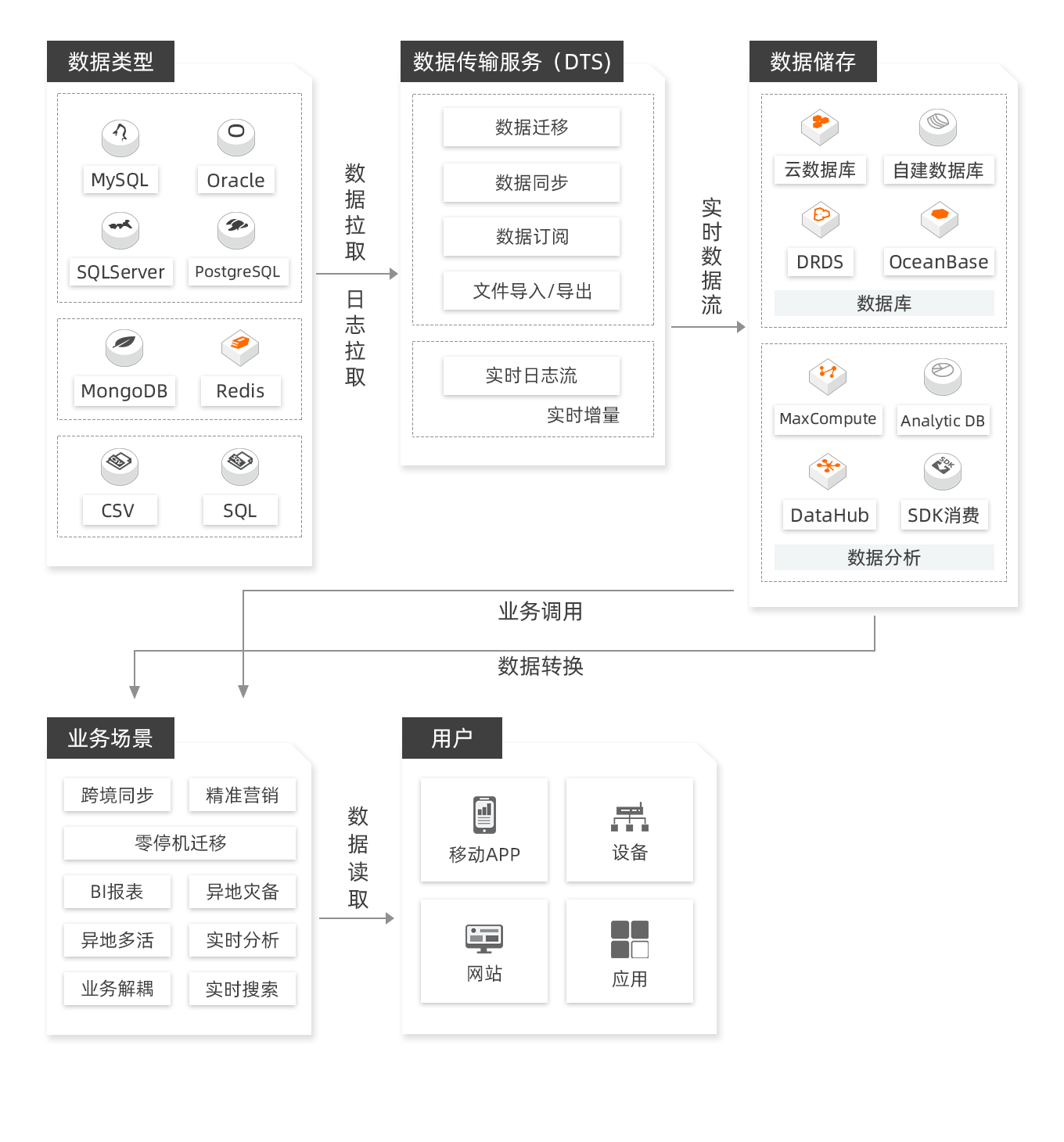 DTS基于数据库日志监听解析的技术实现非侵入式的增量数据实时采集。可将MySQL,PostgreSQL、Oracle、DB2及SQLServer等数据库的增量日志实时采集,实现多种数据库的零停机上云迁移。